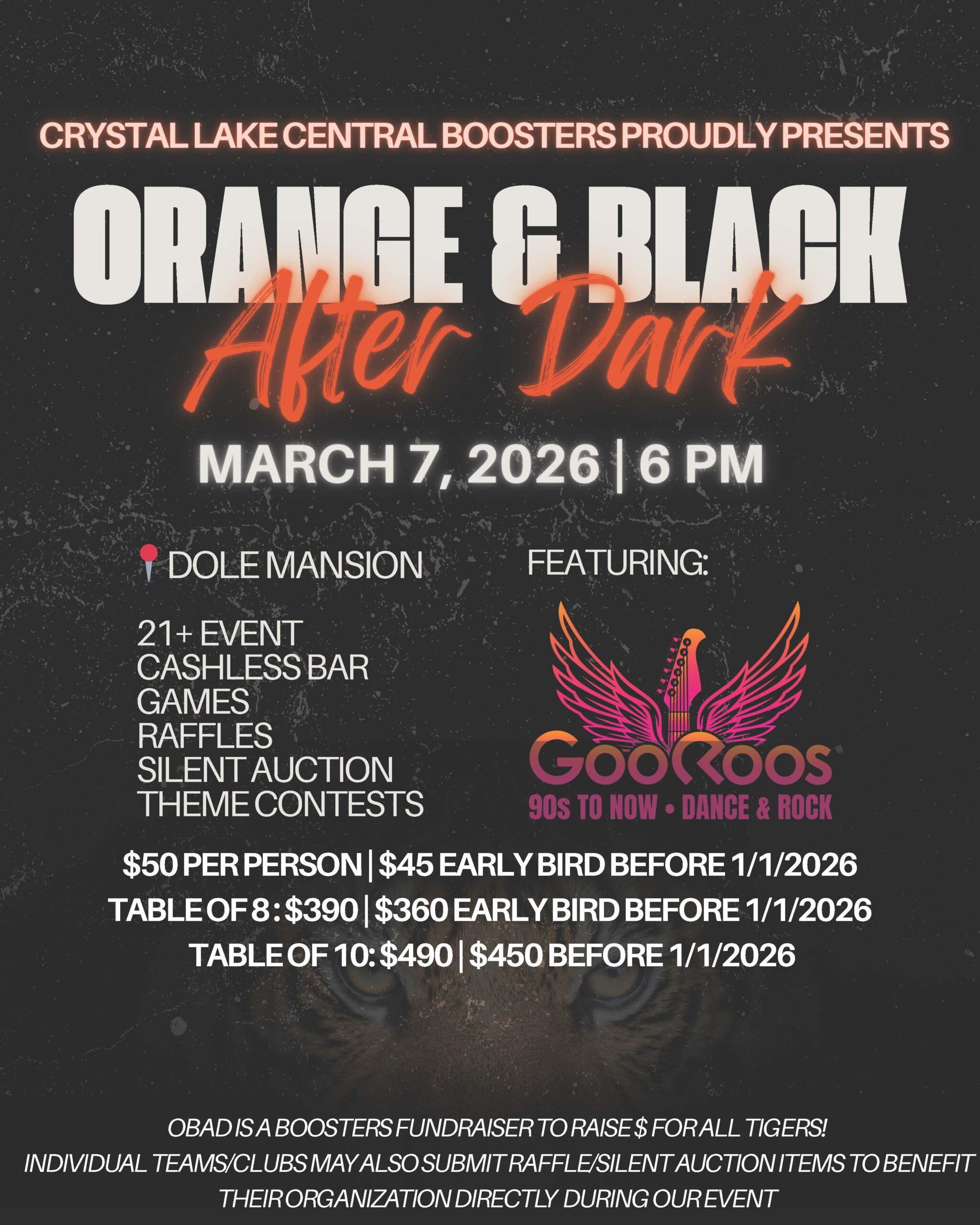 Get ready for an exciting evening with the CLC Boosters at Game Night on March 7, 2026, from 6:00 to 10:30 PM at The Dole! This 21+ event will feature live music, fun games, raffle baskets, and a silent auction. Show your spirit with the Extreme Orange & Black theme and enjoy a night of entertainment with friends. Tickets go on sale January 1st for $50 per person, with tables of 8-10 or individual tickets available. Tables fit 8 people comfortably but can fit 10. For any questions, reach out to Kate at president@clcboosters.org. Don’t miss out on this fun-filled night in support of CLC Boosters!